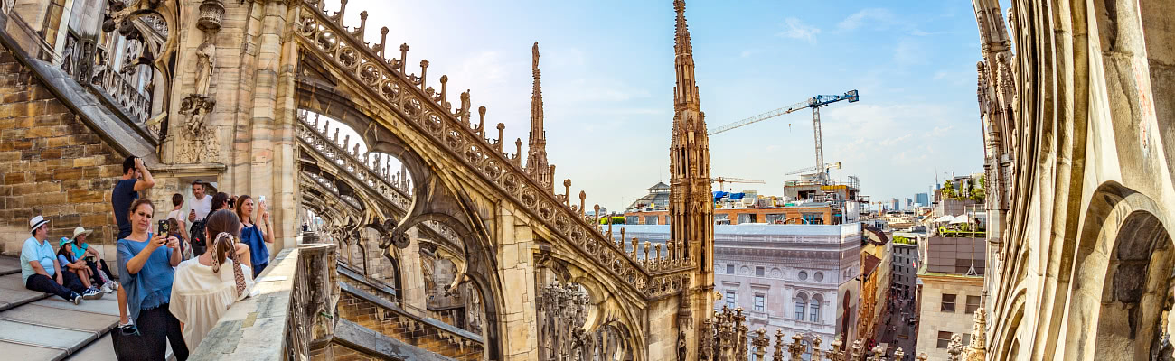 Duomon vetonauloista yksi on myös sen katto, minne voit nousta hissillä tai kavuta portaita pitkin. Katolta aukeavat erityisen hienot näkymät auringonlaskun aikaan ja kirkkaalla säällä, jolloin näkyy aina Sveitsiin asti.